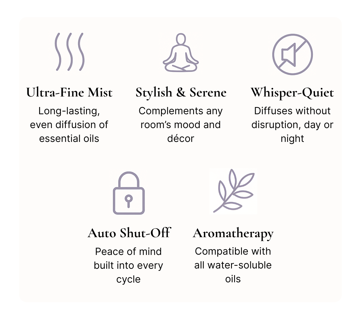 “A beautiful addition to my home. The mist is soft, quiet, and fills the space without being overpowering.”
